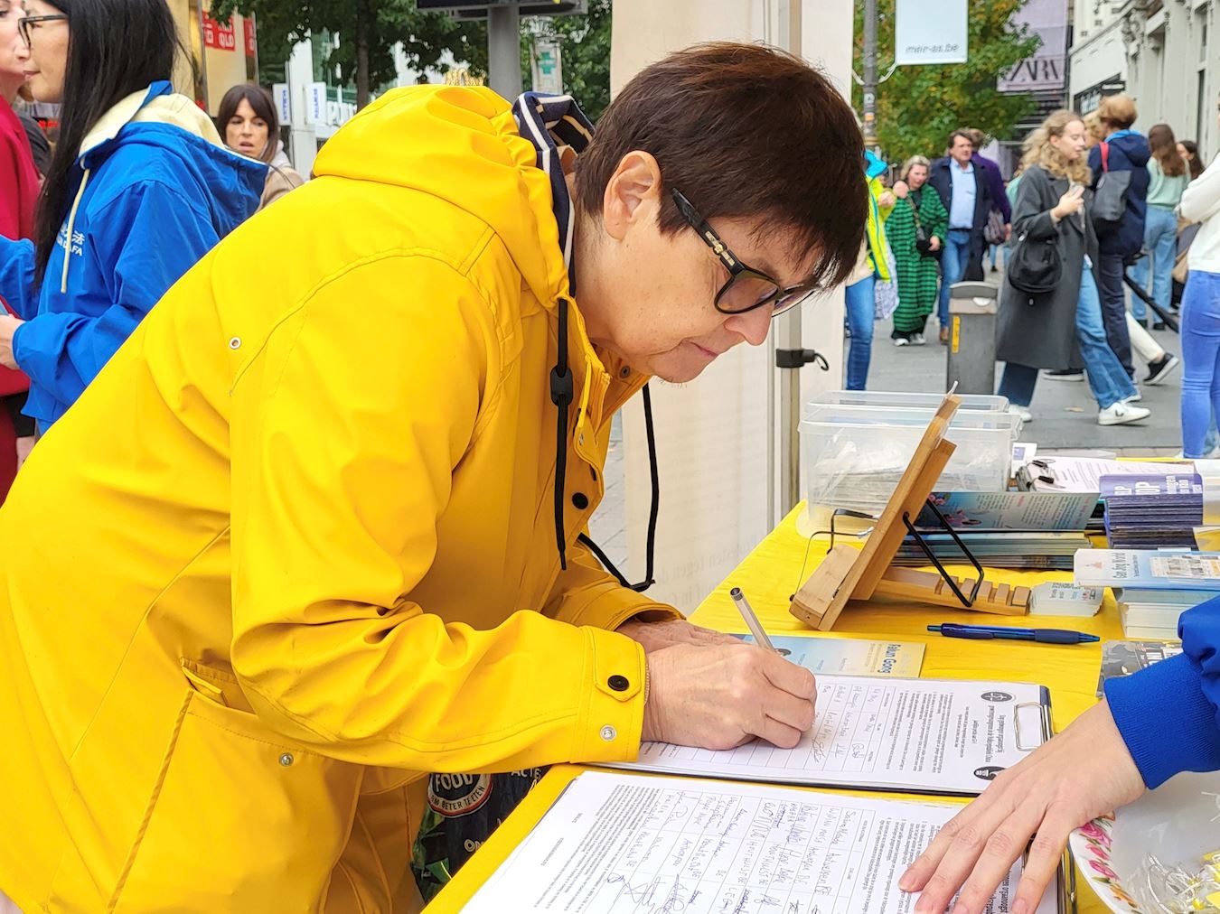 Stefani, njen muž i njihovo troje dece su gledali kako praktikanti rade vežbe. Posetili su štand da saznaju više. Stefani je rekla da joj tradicionalne vrednosti odgovaraju. Kada je saznala za progon, rekla je: „Vlast to ne bi trebalo da radi. Ljudi treba da imaju pravo da biraju svoja uverenja. Meditacija i kultivacija su prave stvari koje treba raditi.” Oni su odmah potpisali peticiju protiv prinudnog uzimanja organa u Kini.