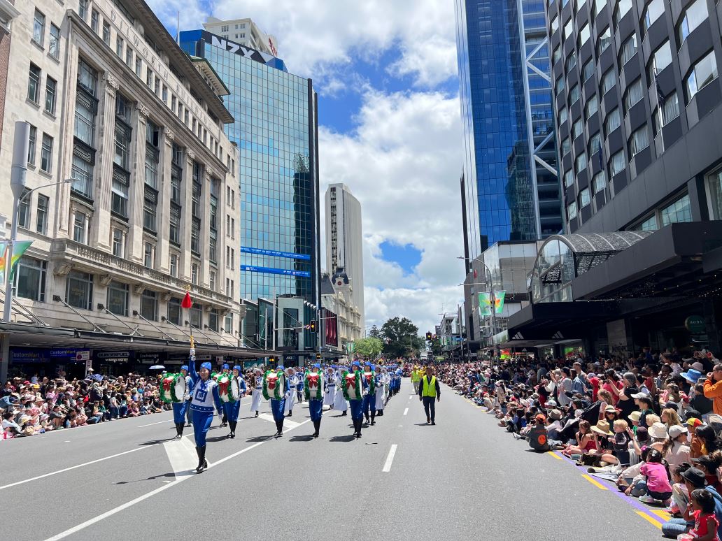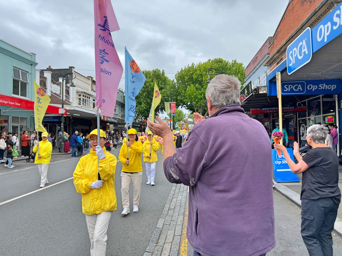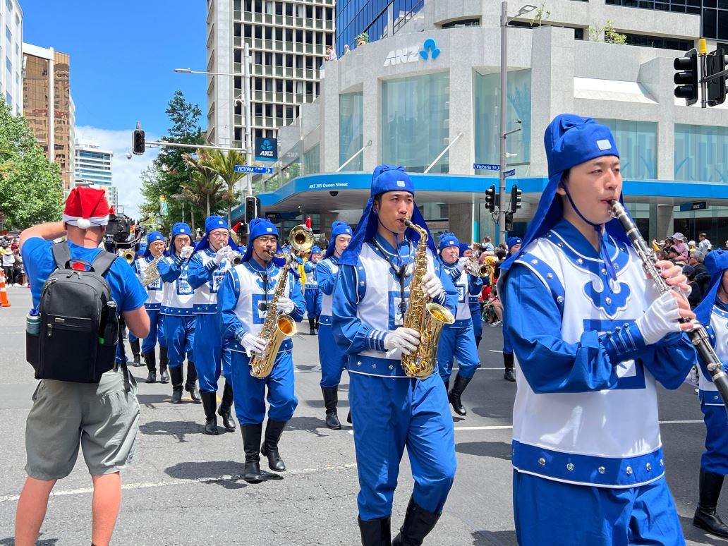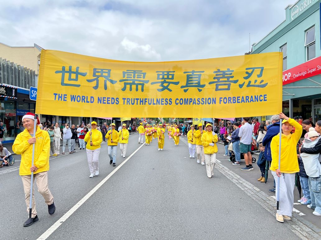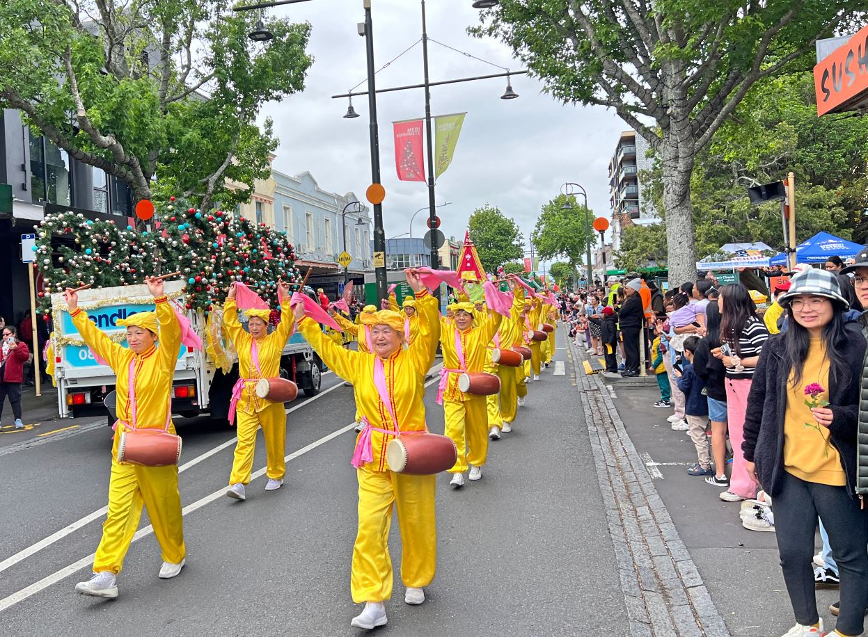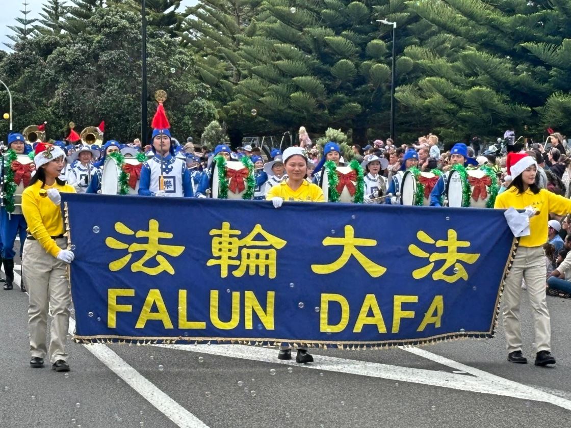 Na Novom Zelandu, Tian Guo Marching Band Falun Dafa praktikanata, plesači zmajeva i tim bubnjara sudjelovali su u četiri božićne parade 23. i 24. studenog 2024. Njihovi su nastupi bili dobro primljeni od strane gledatelja i dobili su pljesak puno puta.