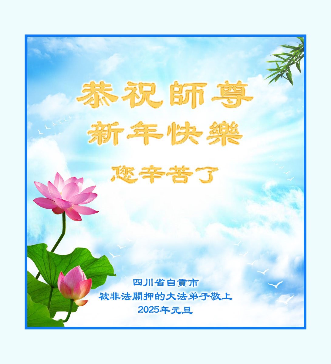 Uprkos brutalnom i nehumanom progonu, Falun Dafa praktikanti se nikada nisu pokolebali u svojoj veri. Odlučni su da rade bolje i spasu više ljudi. U ovom izveštaju prenosimo čestitke nekih od zatvorenih praktikanata, koji se zahvaljuju majstoru Liju, osnivaču Falun Dafe, što im je ponudio spas, i žele mu srećnu Novu godinu.