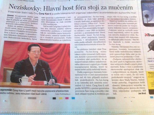 Češka televizija je izvijestila: „Rečeno je da je Zhang Gaoli odgovoran za uhićivanje i mučenje Falun Gong praktikanata.“