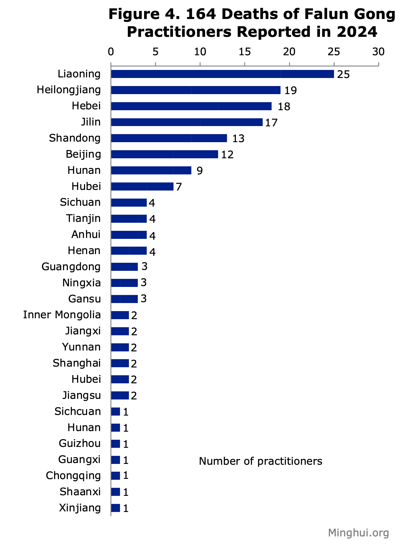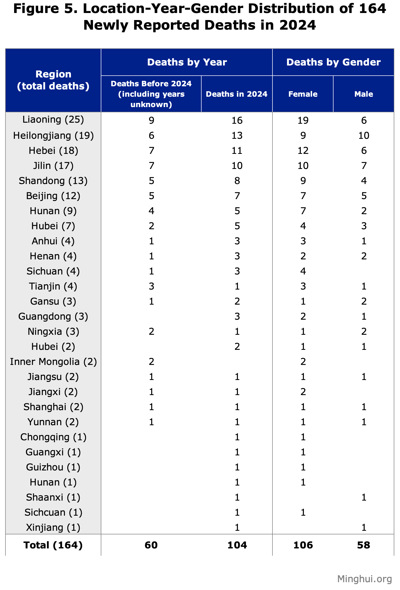 Od 164 umrlih praktikanata, 106 je žena, a dolaze iz 20 pokrajina, 4 autonomne regije i 4 općine pod centralnom kontrolom. Liaoning prijavljuje najviše slučajeva (25), od kojih 16 pripada 2024., a 9 ranijim godinama. Heilongjiang je na drugom mjestu s 19 slučajeva, od čega 13 pripada 2024., a 6 iz ranijih godina. Hebei je na trećem mjestu s 18 slučajeva, od čega 11 pripada 2024. te 7 od još ranije. Još tri regije su na dvoznamenkastom broju prijavljenih slučajeva, dok preostale 22 broje jednoznamenkasti broj slučajeva između 1 i 8.