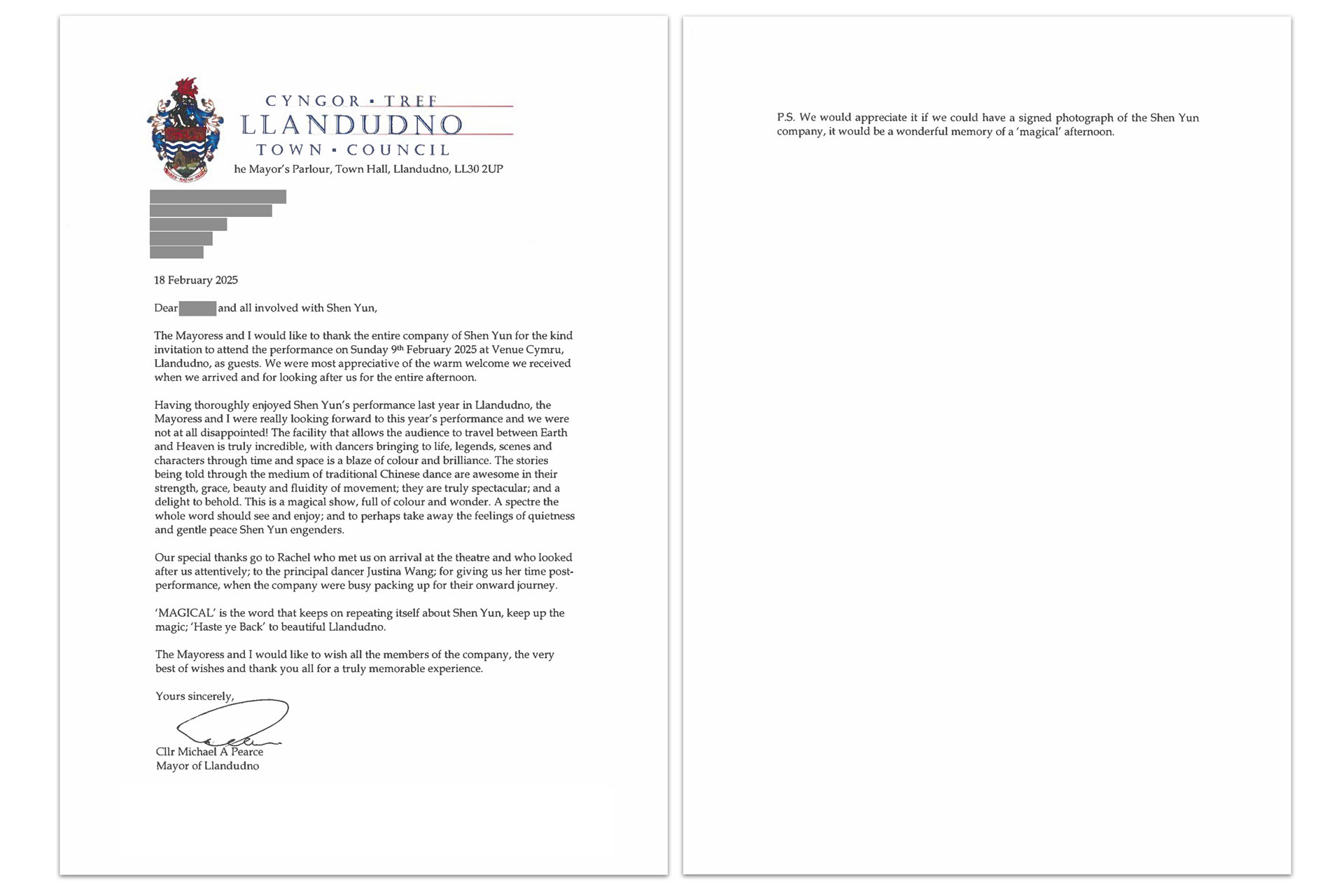 Shen Yun World Company je 8. i 9. februara imala tri nastupa pred punim salama u Llandudnu, Velika Britanija. Michael Pearce, gradonačelnik Llandudna, i njegova supruga su Shen Yun gledali u Llandudnu 9. februara. Nakon nastupa, gradonačelnik je napisao pismo lokalnom sponzoru da mu izrazi svoju zahvalnost.