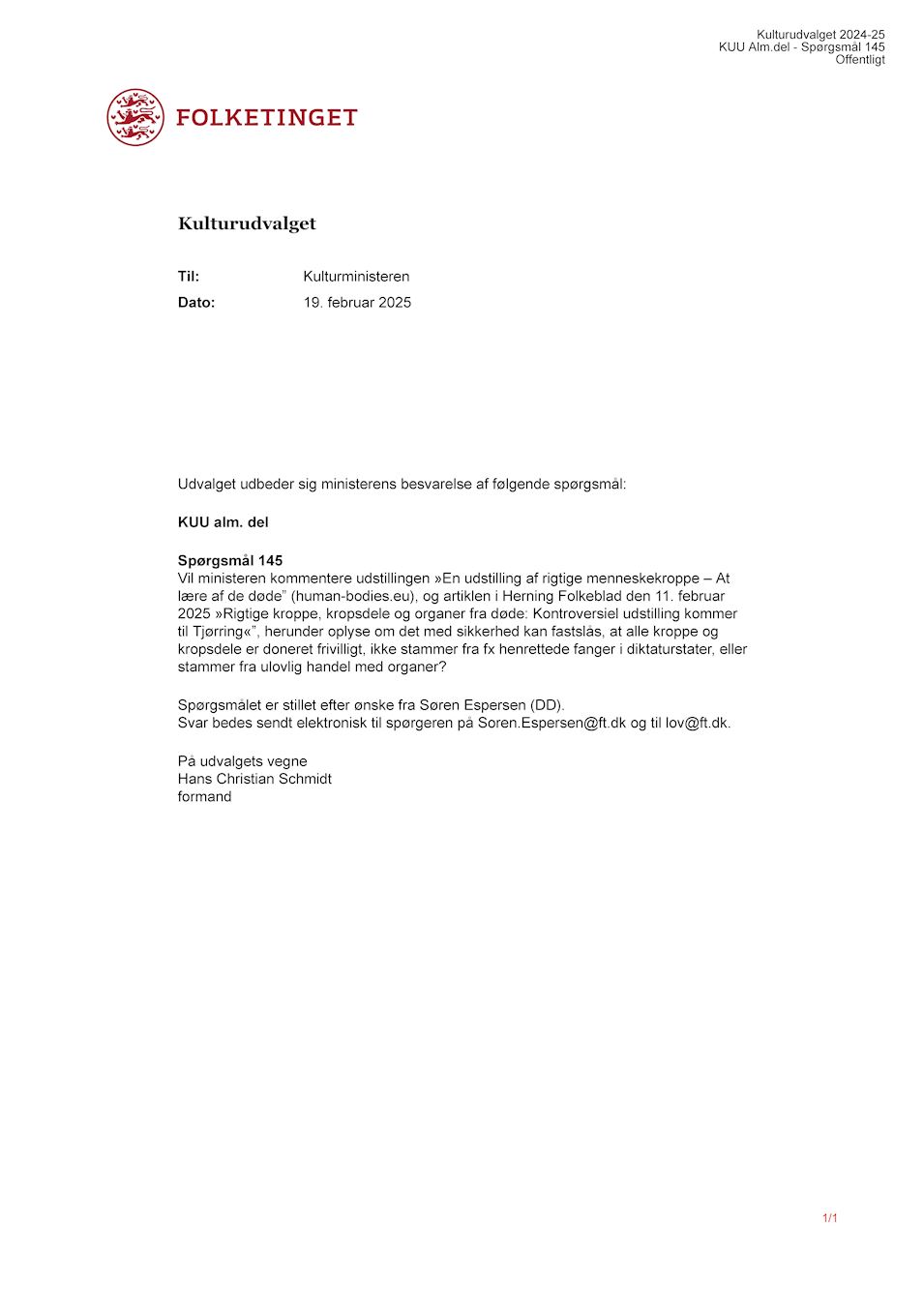 Søren Espersen, viši član Danske demokratske stranke (Danmarksdemokraterne) i predsjednik Vjerskog odbora, upitao je ministra kulture 19. veljače: “Može li se sa sigurnošću utvrditi da su sva tijela i dijelovi tijela dobrovoljno donirani, da ne potječu od, na primjer, pogubljenih zatvorenika u diktaturama ili da potječu od ilegalne trgovine organima?”