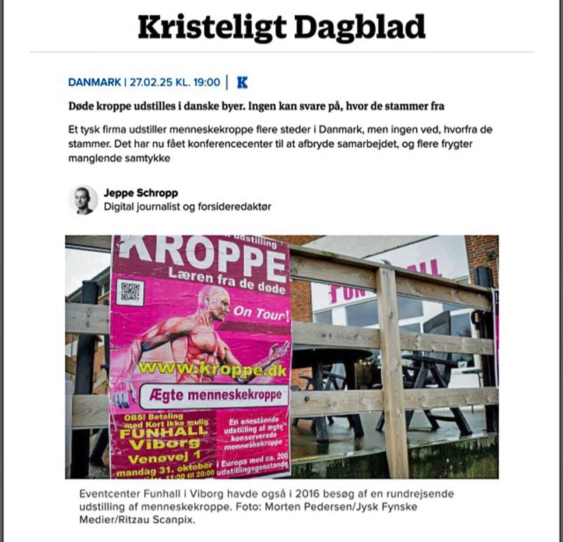 Njemačka tvrtka održala je izložbu ljudskih tijela u nekoliko gradova u Danskoj od početka studenog 2024. do početka ožujka 2025. Budući da organizatori izložbe nisu mogli dokazati odakle su uzorci došli i budući da postoje dokazi o sustavnom progonu Falun Gong praktikanata i disidenata, kao i o prisilnom vađenju organa u Kini, mnogi ljudi u Danskoj imali su pitanja.