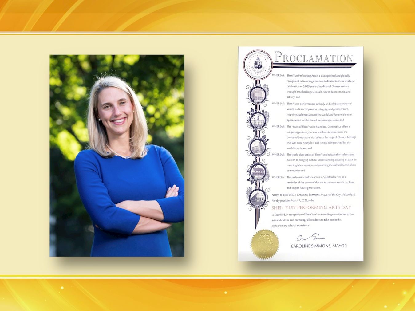 Gradonačelnica Stamforda Caroline Simmons je u svom proglasu napisala: „SADA, I ZATO JA, CAROLINE SIMMONS, gradonačelnica grada Stamforda, ovim proglašavam 7. maj 2025. godine SHEN YUN PERFORMING ARTS DANOM u Stamfordu, u znak podsticanja njegovog izvanrednog doprinosa umjetnosti i kulturi i sveukupnoj umjetnosti i kulturi stanovnika da uzmu učešće u ovom izuzetnom kulturnom iskustvu.”