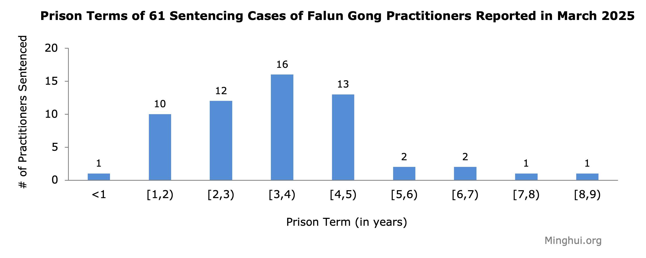 U martu 2025. potvrđen je ukupno 61 slučaj Falun Gong praktikanata koji su osuđeni na zatvorsku kaznu zbog svoje vjere.