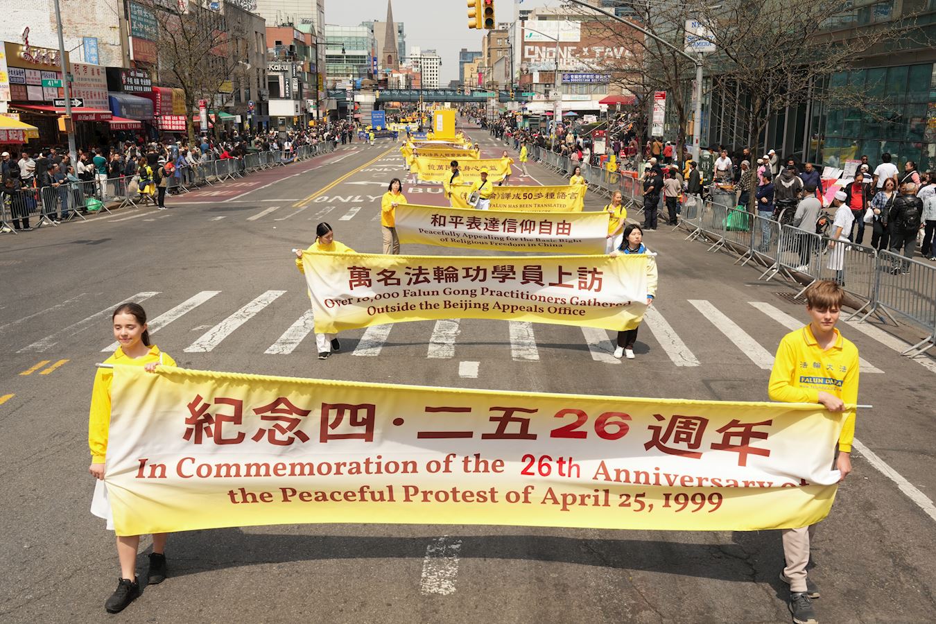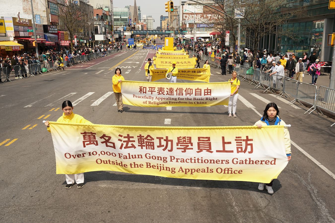 Preko 1.000 Falun Gong (Falun Dafa) praktikanata iz šireg područja New Yorka je, u subotu 19. aprila 2025., održalo veliku paradu u drugom najvećem kineskom kvartu u SAD-u – Flushing, New York. Ova manifestacija je obilježila 26. godišnjicu mirnog protesta 10.000 praktikanata Falun Gong-a na Zhongnanhai 25. aprila 1999. Paradom su također upućene čestitke za 445 miliona Kineza koji su napustili Komunističku partiju Kine i njene pridružene organizacije.