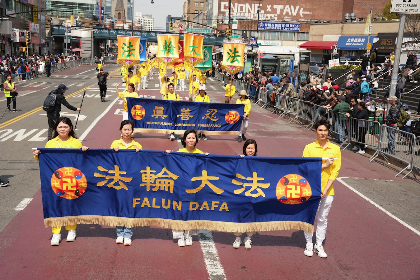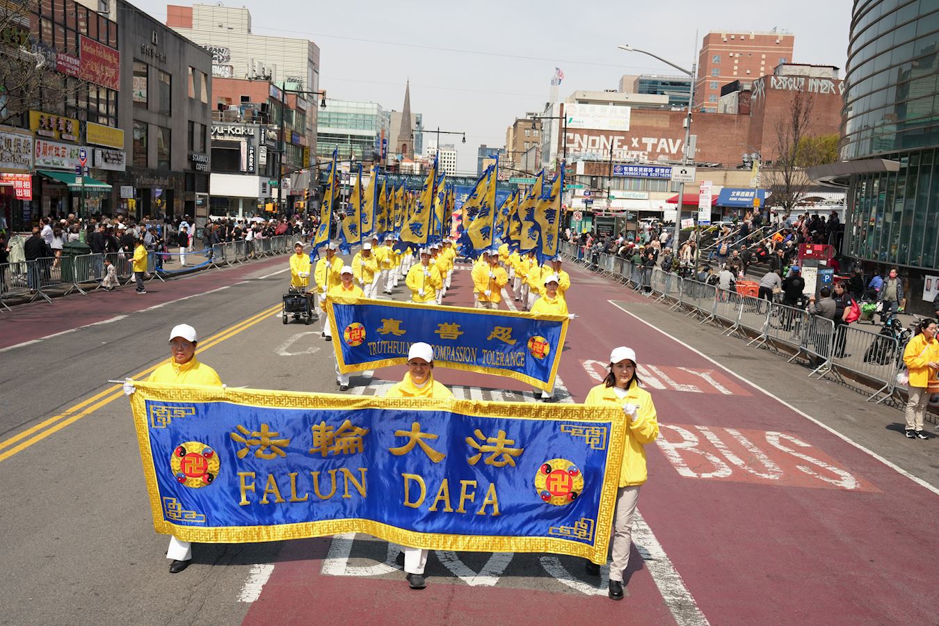 U 12 sati, sa Tian Guo Marching Bandom koji je preuzeo vodstvo, praktikanti su marširali glavnom ulicom, Flushing. Nastup benda je dirnuo gledaoce. Jedna osoba je uzviknula: "Samo jedna riječ, sjajno!" Drugi je rekao: "Falun Dafa je nevjerovatan!" Ostali komentari su bili: “Istinitost, Dobrodušnost i Tolerancija donose nadu!“ i "Ne mogu prestati plakati, toliko su dirljivi, osjećam se ponosno zbog njih. Morate pokazati svijetu progon koji se još uvijek dešava, i mora prestati." “Nada za Kinu leži u Falun Gong-u.”