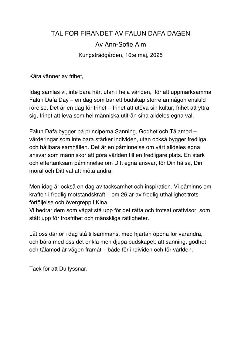 An-Sofi Alm, poslanica, napisala je: „Danas se okupljamo, ne samo ovde, već širom sveta, da obeležimo Dan Falun Dafe - dan koji nosi poruku veću od bilo kog pojedinačnog pokreta. To je dan slobode - slobode da se praktikuje sopstvena kultura, slobode da se izrazi, slobode da se živi kao celovita osoba na osnovu sopstvenih izbora.