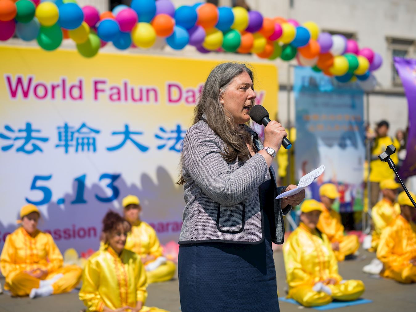 U svom govoru, Caroline, predstavnica Falun Dafa udruženja, je kazala: „U preko 100 zemalja širom svijeta, ljudi rade nešto izvanredno – zajedno slave dan Falun Dafa.