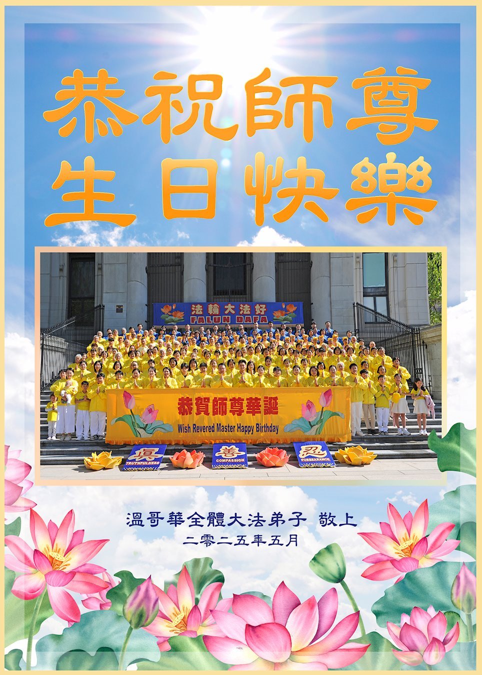 Praktikanti u Vancouveru, Kanada, slave Svjetski dan Falun Dafa i žele Učitelju Li-u sretan rođendan.