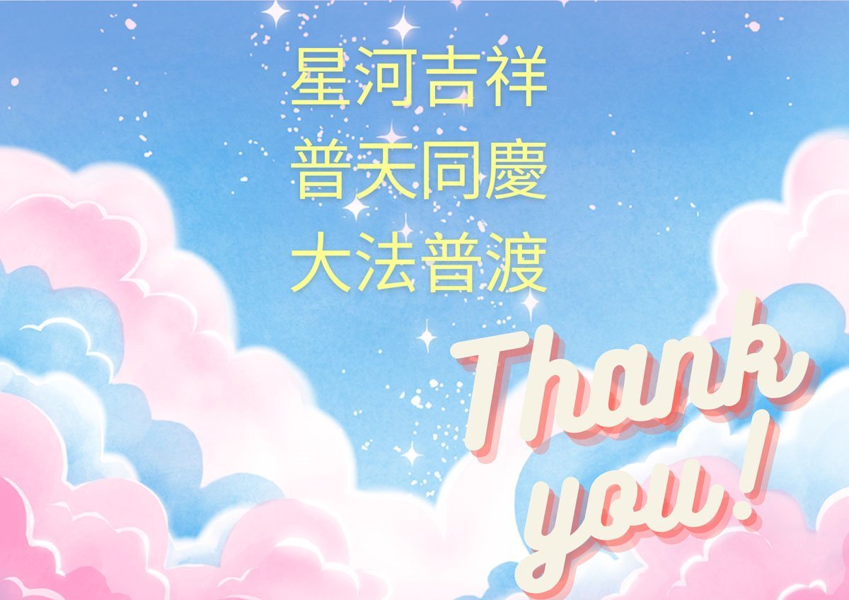 Hvala Vam Učitelju milijun puta na vašem vodstvu i zaštiti u proteklih dvadeset devet godina. Bez obzira koliko sam dobro ili loše postupao, nikada niste odustali od mene. Od sada nadalje, ne mogu više gubiti vrijeme koje je Učitelj produžio za svoje učenike, živa bića i svako biće podnoseći velike patnje. Moram biti marljiv u svojoj kultivaciji i pomagati Učitelju u spašavanju živih bića! Moram objašnjavati istinu o Dafa gdje god idem.