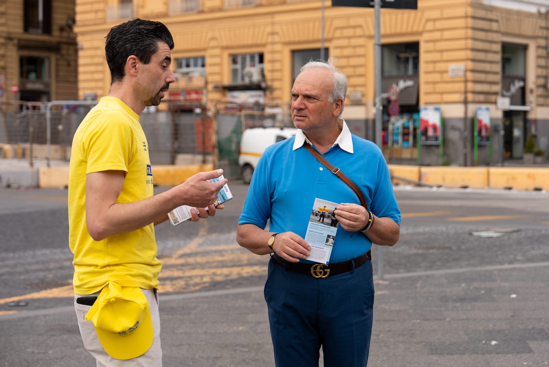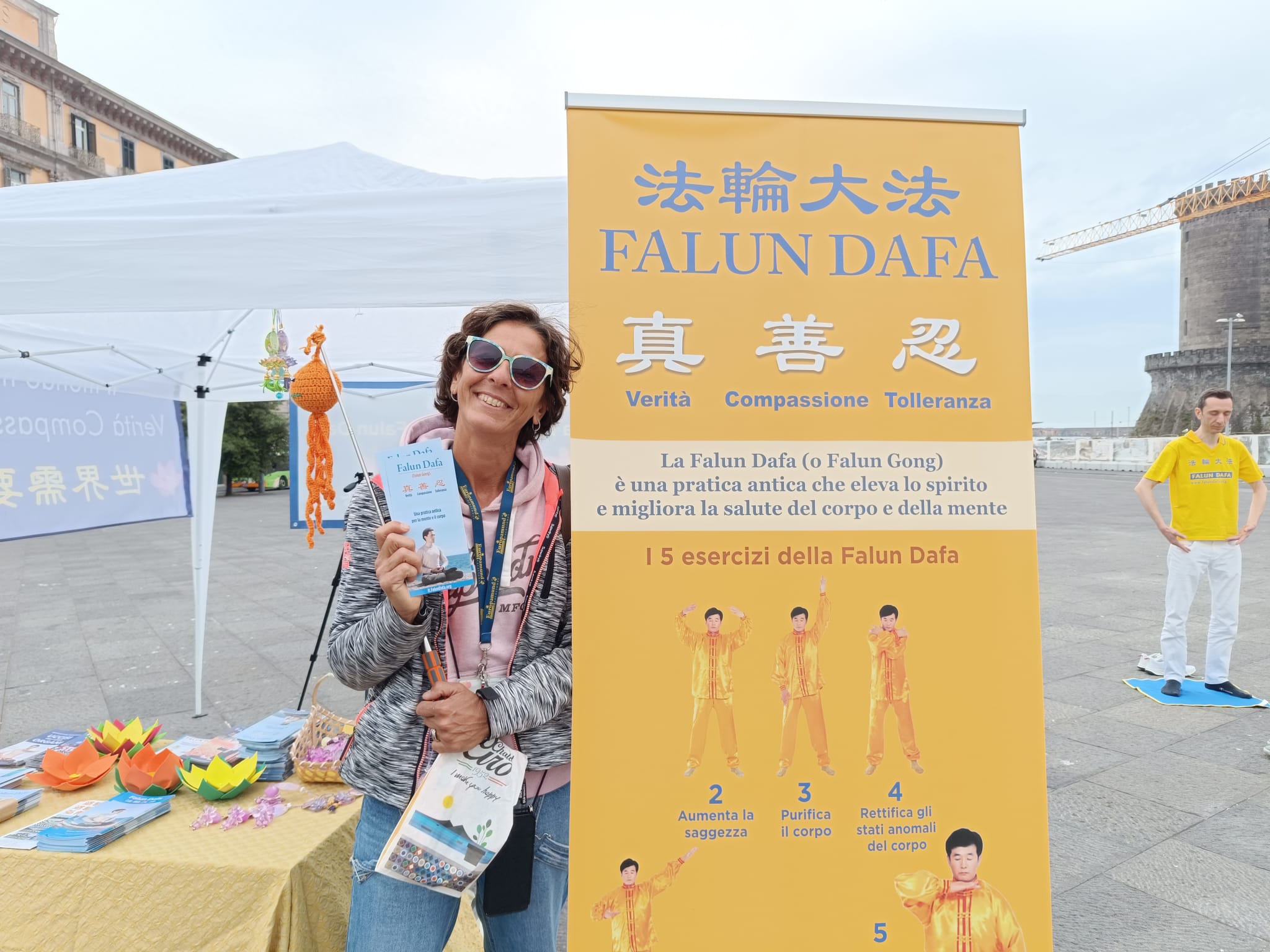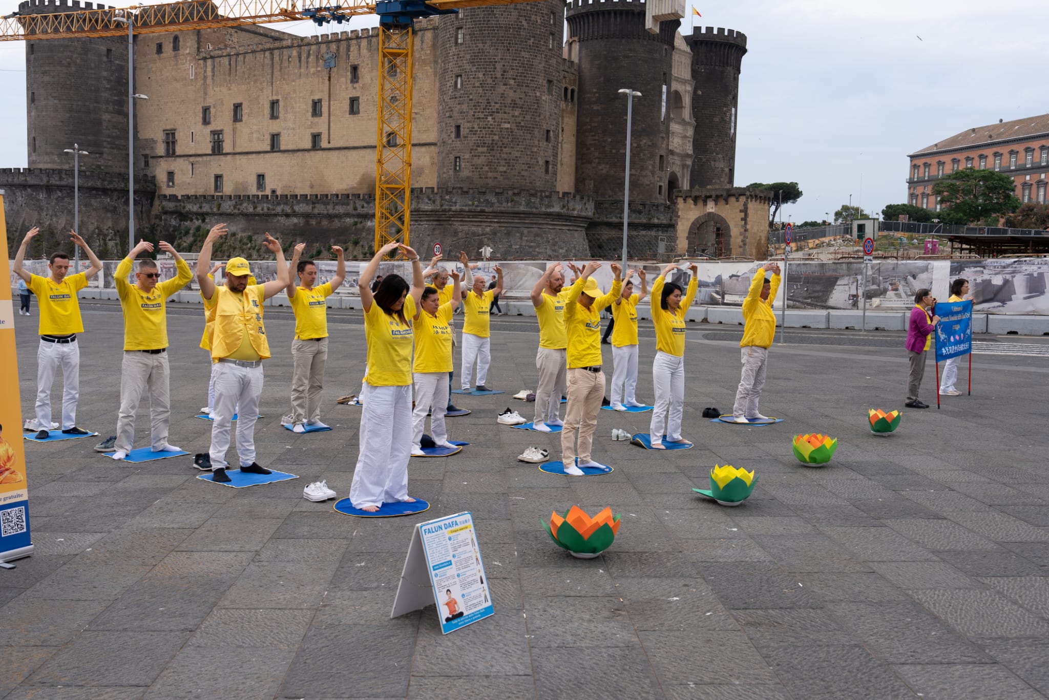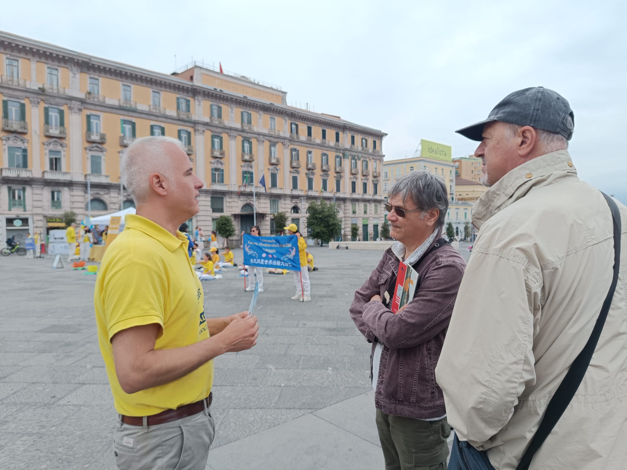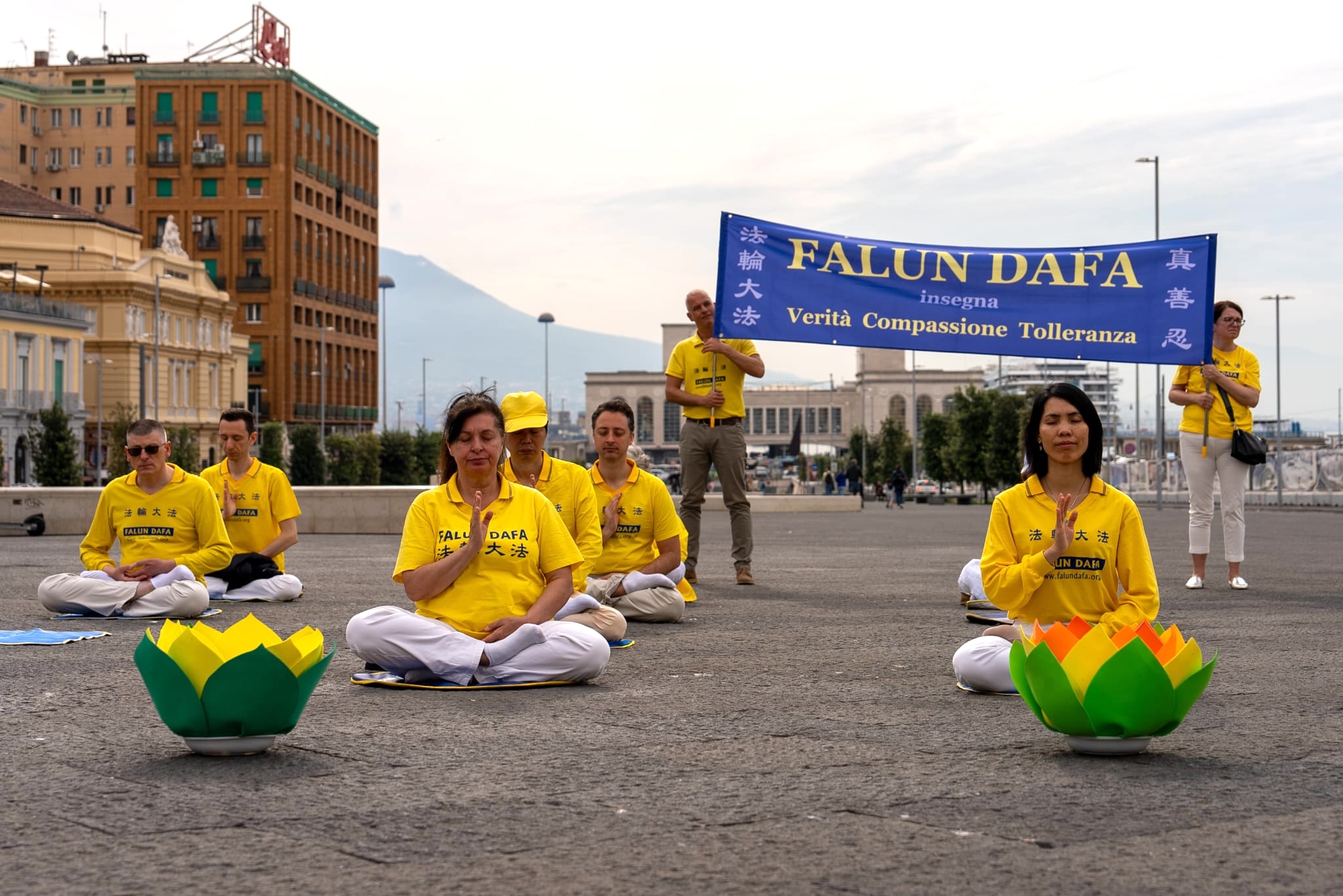 U čast Svetskog dana Falun Dafa i sa željom da čestitaju rođendan osnivaču, Učitelju Li Hongžiju, praktikanti Dafa iz celog Italija organizovali su grupne vežbe i aktivnosti ispred zgrade gradske uprave u Napulju 11. maja 2025. godine. Napulj je u južnom delu Italije, treći po veličini grad Italije i najgušće naseljeni grad u Evropi.