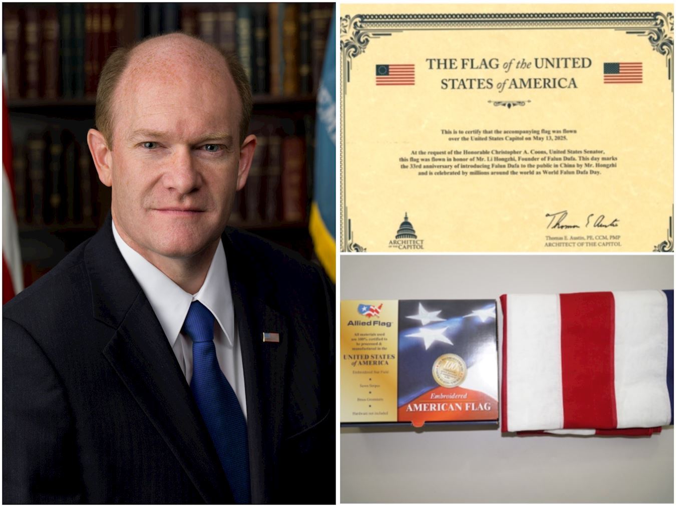 Državna zastava koja se vijori iznad Kapitola Sjedinjenih Američkih Država uručuje se kao počast pojedincu ili grupi, a izdaje se i potvrda. Na potvrdi o uručenju državne zastave Li Hongzhiju piše: „Ovim se potvrđuje da se priložena zastava vijorila iznad Kapitola Sjedinjenih Američkih Država 13. maja 2025. godine. Na zahtjev uvaženog Christophera A. Coonsa, senatora Sjedinjenih Američkih Država, ova zastava se vijorila u čast gospodina Li Hongzhija, osnivača Falun Dafa. Ovim se danom obilježava 33. godišnjica predstavljanja Falun Dafa javnosti u Kini od strane gospodina Hongzhija, i milioni ljudi širom svijeta slave ovaj dan kao Svjetski Falun Dafa dan.“