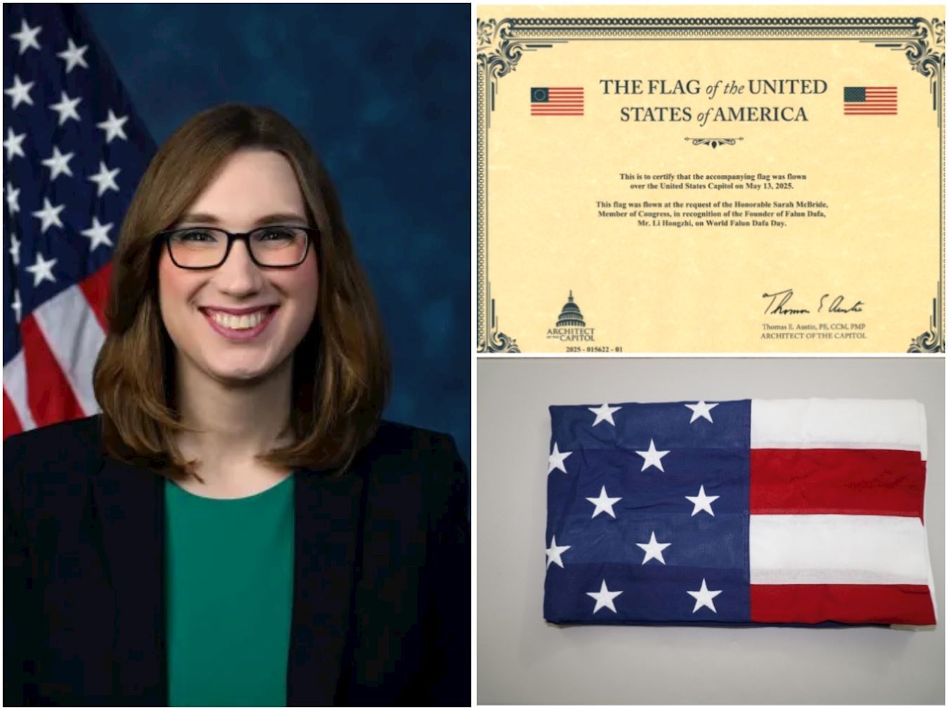 Sarah McBride, zastupnica iz Delawarea, uručila je Li Hongzhiju američku zastavu koja je 13. maja bila istaknuta na američkom Kapitolu, te mu za to izdala potvrdu. Zastupnica Sarah McBride iz Delawarea također je zatražila podizanje zastave na Kapitolu u čast gospodina Lija. Na certifikatu (potvrdi) piše: „Ovim se potvrđuje da se priložena zastava vijorila iznad Kapitola Sjedinjenih Država 13. maja 2025. godine. Ova zastava se vijorila na zahtjev časne Sarah McBride, članice Kongresa, u znak priznanja osnivaču Falun Dafa, Li Hongzhiju, na Svjetski dan Falun Dafa.“