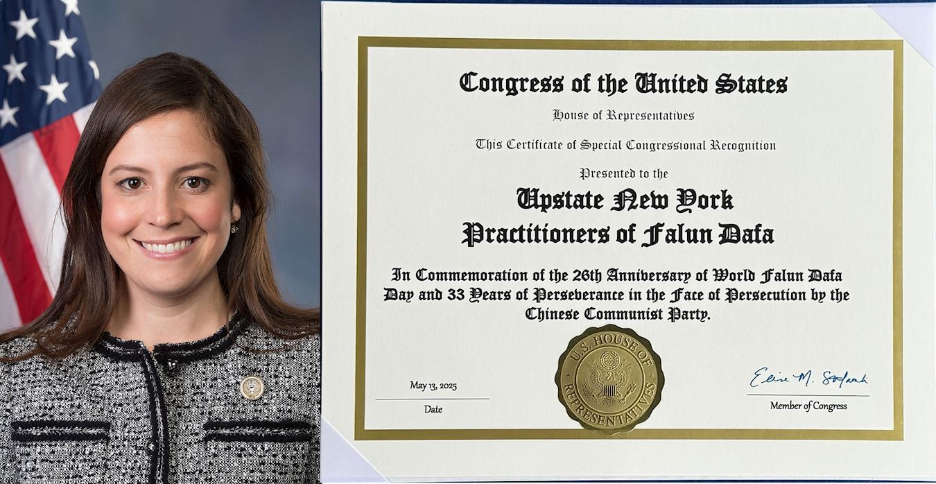 Zastupnica Elise Stefanik je napisala: „Ova Potvrda o posebnom kongresnom priznanju dodijeljena je Falun Dafa praktikantima iz sjevernog dijela države New York, u spomen na 26. godišnjicu Svjetskog Falun Dafa dana i 33 godine njihove upornosti u suočavanju s progonom od strane Komunističke partije Kine.“