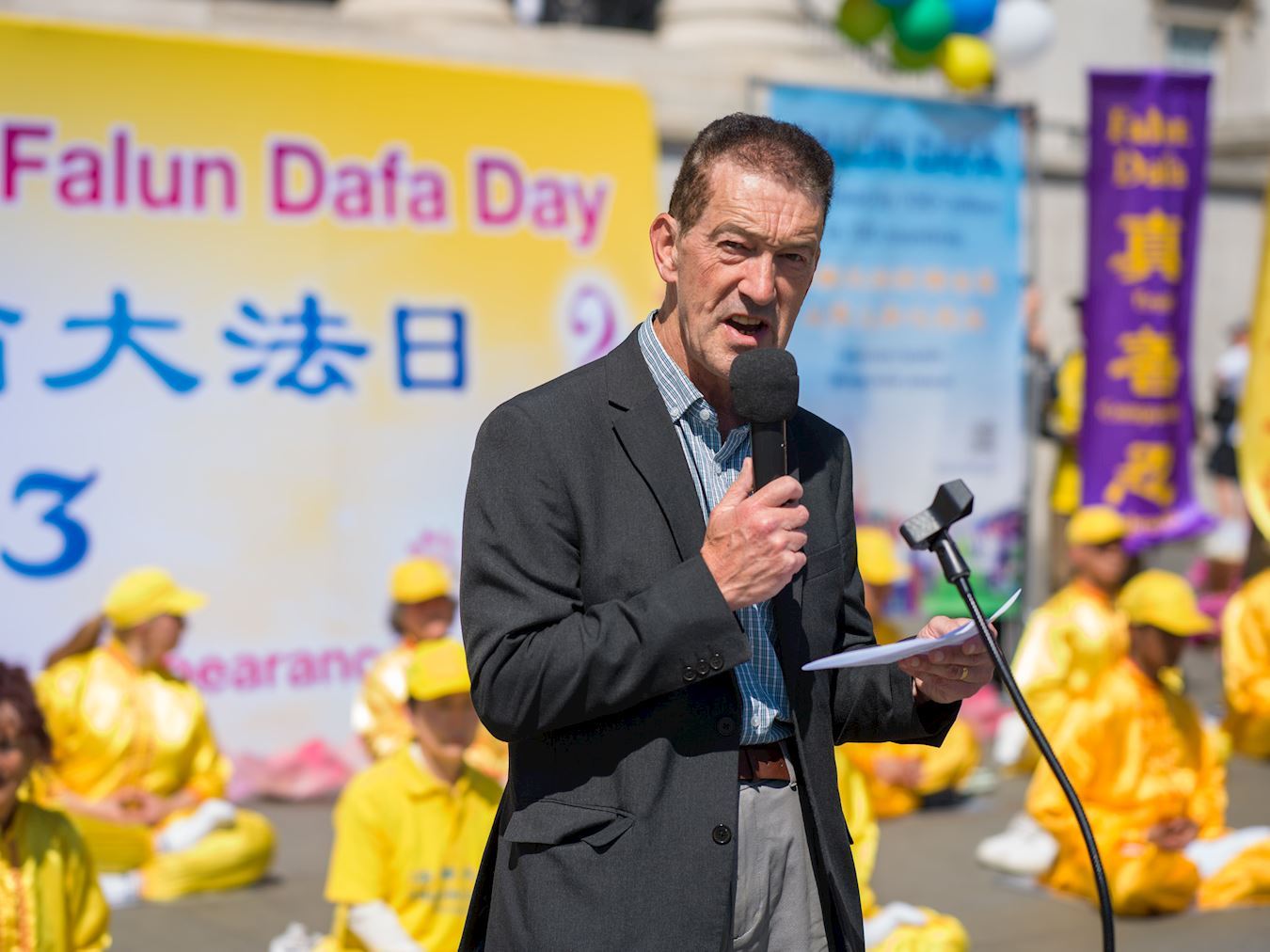Praktikanti iz Ujedinjenog Kraljevstva održali su paradu i miting u centru Londona 10. maja, kako bi proslavili Svetski dan Falun Dafe. Benedikt Rodžers, zamenik predsednika komisije za ljudska prava Konzervativne partije, rekao je u svom govoru: „Tri glavne vrednosti kojih se vi, kao praktikanti Falun Gonga, pridržavate – Istinitost-Blagost-Trpeljivost – nisu samo vrednosti Falun Dafe. Kao hrišćanin, ja delim iste vrednosti. To je takođe verovanje mnogih drugih sledbenika religija. Ovi principi su univerzalni, oni su opšte dobro cele ljudske rase.