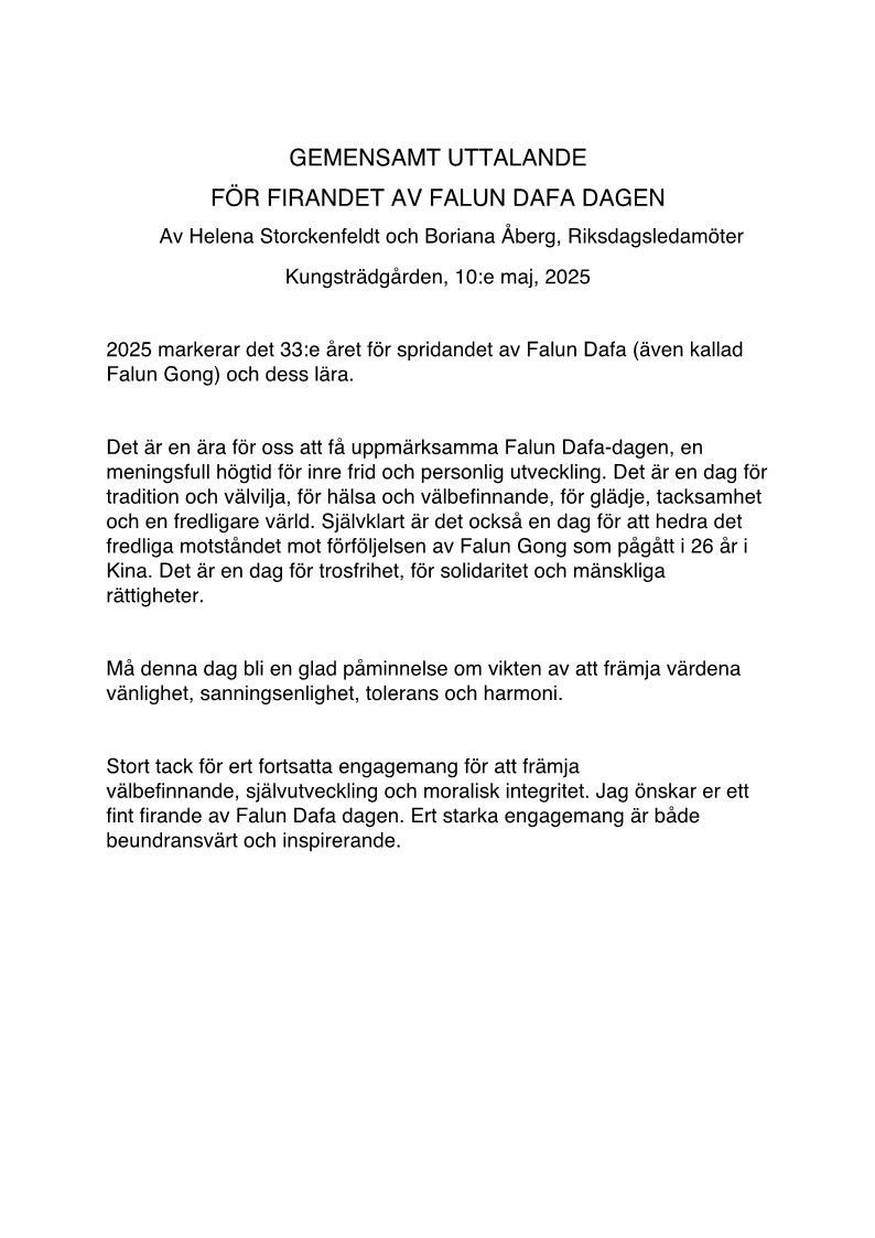 Poslanica Helena Štorkenfeld i poslanica Boriana Oberg su napisale: „Čast nam je da proslavimo Dan Falun Dafe, značajnu proslavu unutrašnjeg mira i ličnog razvoja. To je dan tradicije i dobre volje, zdravlja i blagostanja, radosti, zahvalnosti i mirnijeg sveta.
