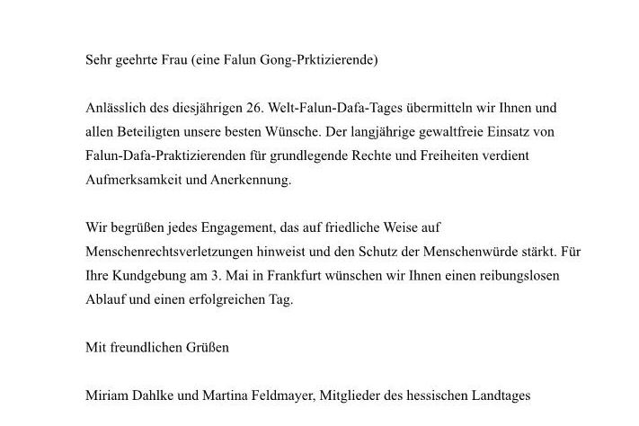 Hajko Kasekert, poslanik Parlamenta pokrajine Hesen, napisao je: „Povodom 26. Svetskog dana Falun Dafe, šaljem vam svoje najtoplije pozdrave i najdublje poštovanje.