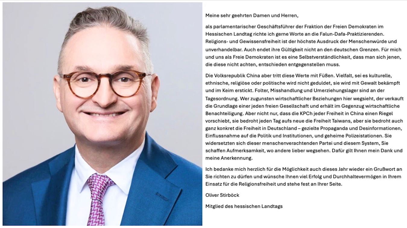 Oliver Štirbek, poslanik parlamenta pokrajine Hesen i izvršni predsednik Slobodarske partije (FDP), naveo je u svom pismu: „Želeo bih da vam se mnogo zahvalim na prilici da vam se i ove godine obratim i poželim vam mnogo uspeha i istrajnosti u vašoj posvećenosti verskoj slobodi, i čvrsto stojim uz vas.“