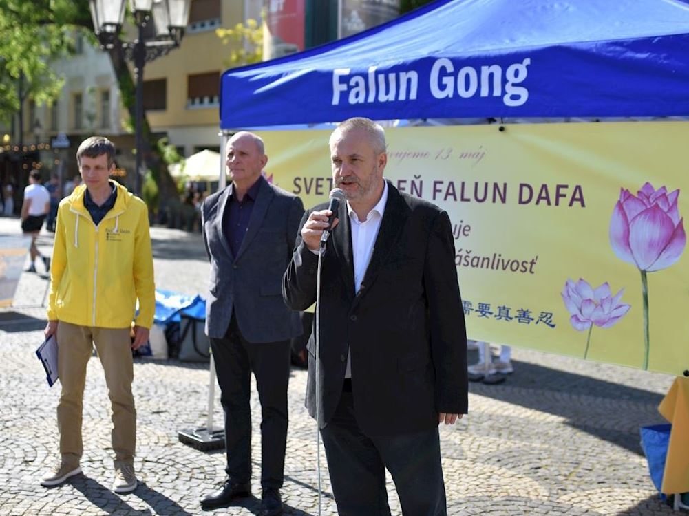 Na mitingu, Ondrej Dostal, poslanik Nacionalne skupštine Slovačke Republike, rekao je u svom govoru: „Želim da vam izrazim svoju podršku i solidarnost, kao što sam to činio i proteklih godina.“ On je pohvalio praktikante za njihovu izuzetnu posvećenost i odlučnost u zastupanju vrednosti Istinitosti, Blagosti i Trpeljivosti, širom sveta. Svoj govor je zaključio rečima: „Želim da izrazim svoju solidarnost, svoju podršku, a takođe i svoje divljenje, jer važno je izdržati, a vi pokazujete da imate odlučnost, a takođe i sposobnost da izdržite.“